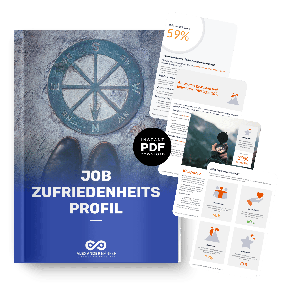 Dein Job-Zufriedenheitsprofil mit über 15 Seiten erhält dein individuelles Ergebnis in den Kategorien Autonomie, Verbundenheit, Sinnhaftigkeit und Kompetenz. Es zeigt dir, wo du Entwicklungspotenzial hast und sofort anwendbare Strategien um dort hinzukommen.